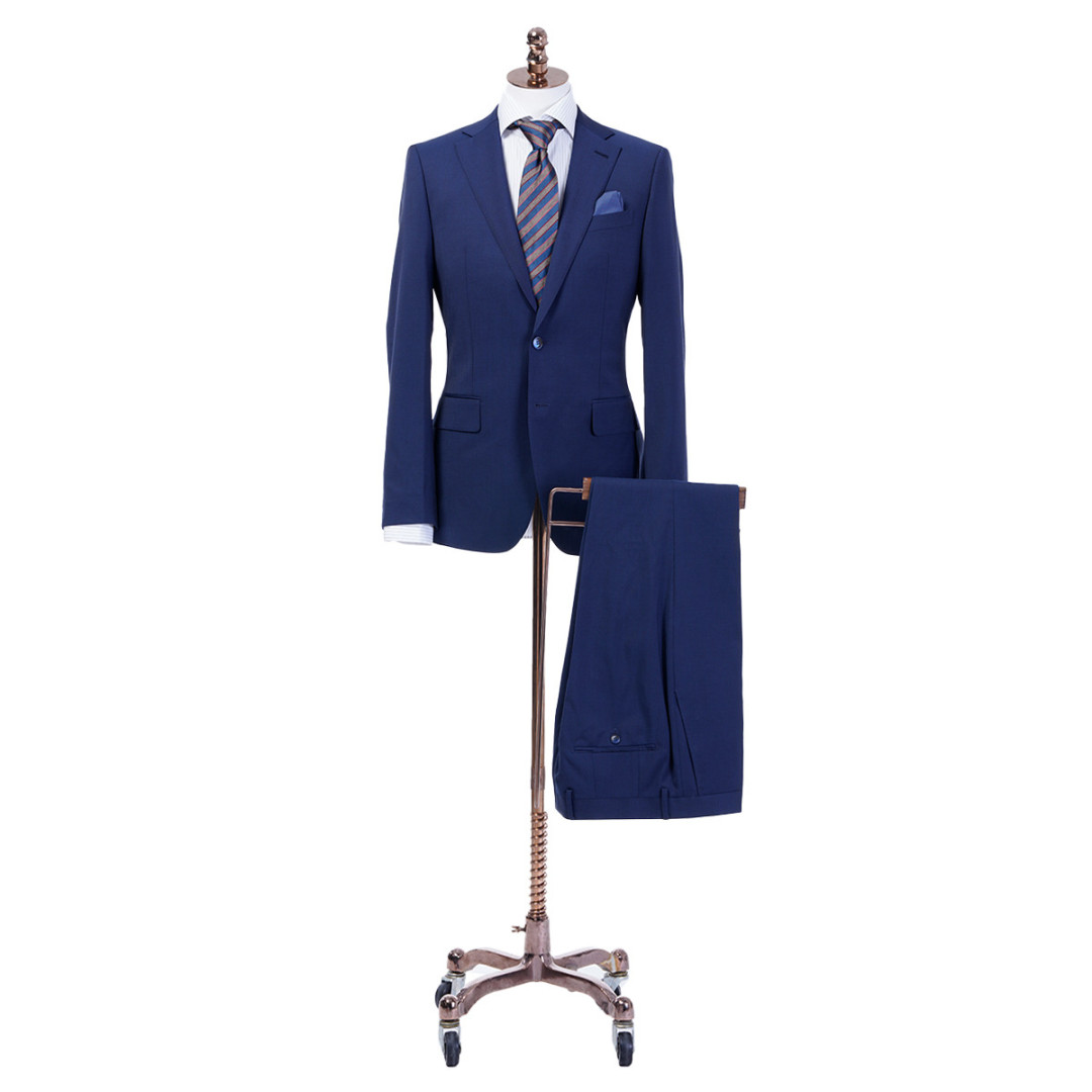 This luxury 280g, 100% Italian wool blue suit is another classic. 4 deep blue kissing buttons paired with a beautiful pick stitch notch lapel is sure to become one of your quick favorites.