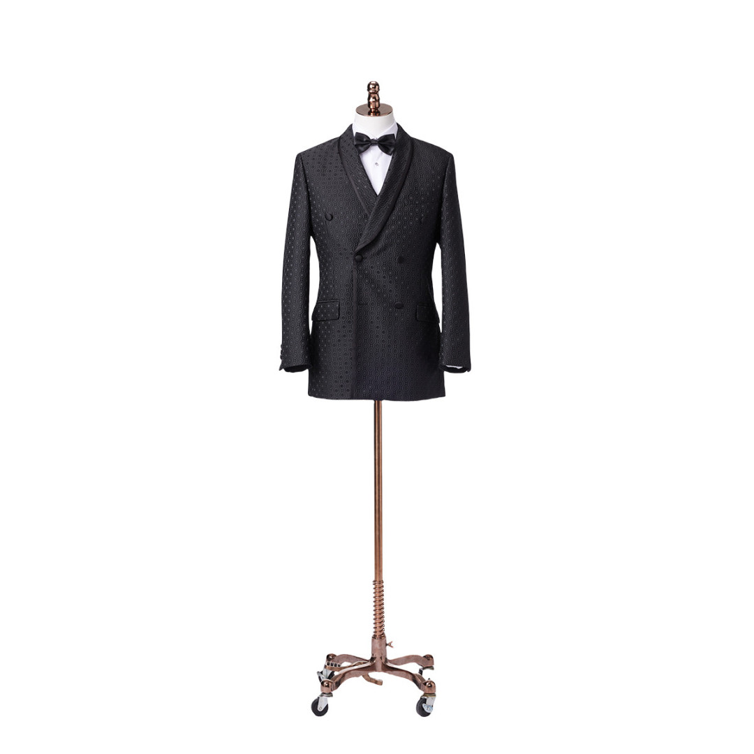 Just as a hunter finds his mark, this custom black tuxedo is sure to leave an impression. Double breasted 6 button this English staple paired with black satin buttons and a shawl lapel is surly to hit its mark.