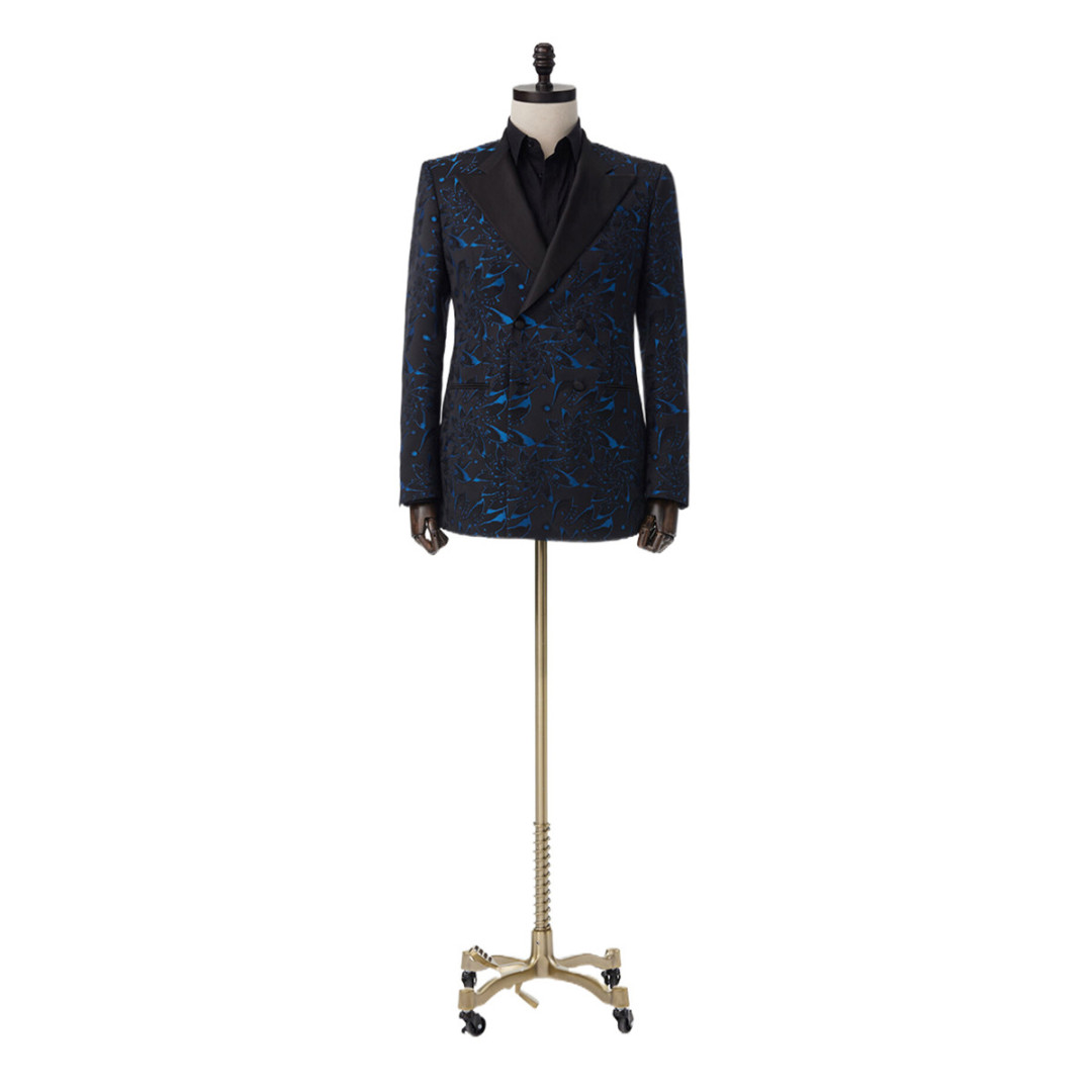 Blue flowers often symbolize peace, serenity, trust, and openness. This one of a kind custom blue floral fabric is just that. Double breasted 4 button has been a sign of trust and elegance for centuries. Paired with a wide satin black lapel and buttons this truly is a symbol.