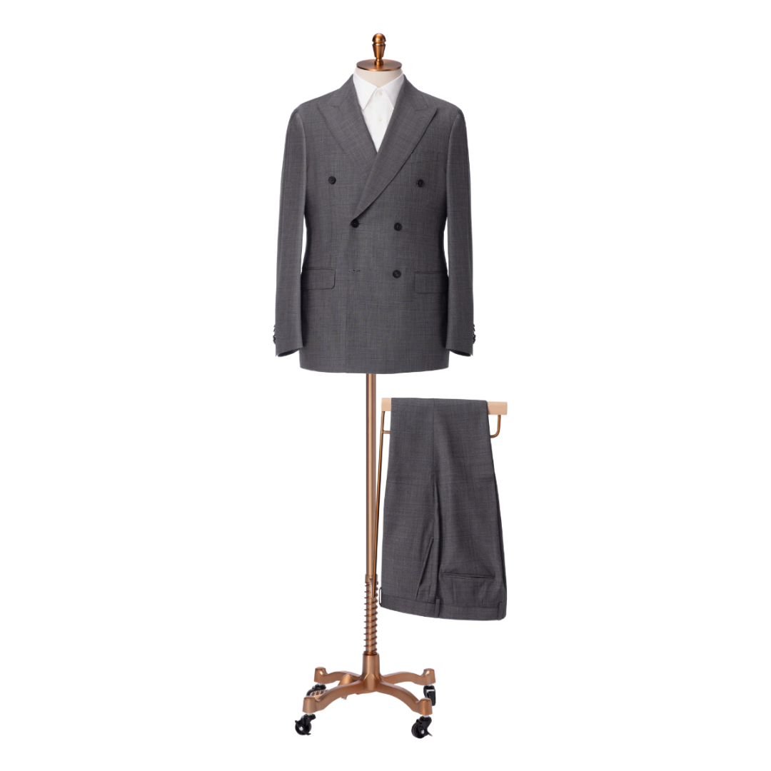 Built to move with you as you zip around. Hamilton is a beautiful 100% wool glen check with a blue accent. Built in a Double breasted six button with besom pockets, this custom suit is built to hold a firm structure while complementing its custom size to your body.
