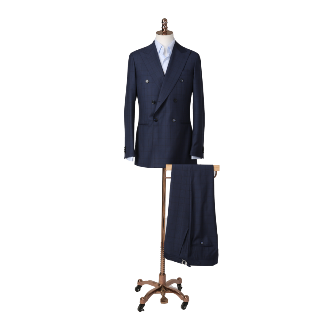 Greek for Anchor, Hector is here to become a rock solid choice in your closet. This beautiful custom, 100% Italian wool double breasted six button blue suit is sure to become your favorite. Wide peak lapels and besom pockets, this dashing fabric is built to shine and show its colors in the summer sun.