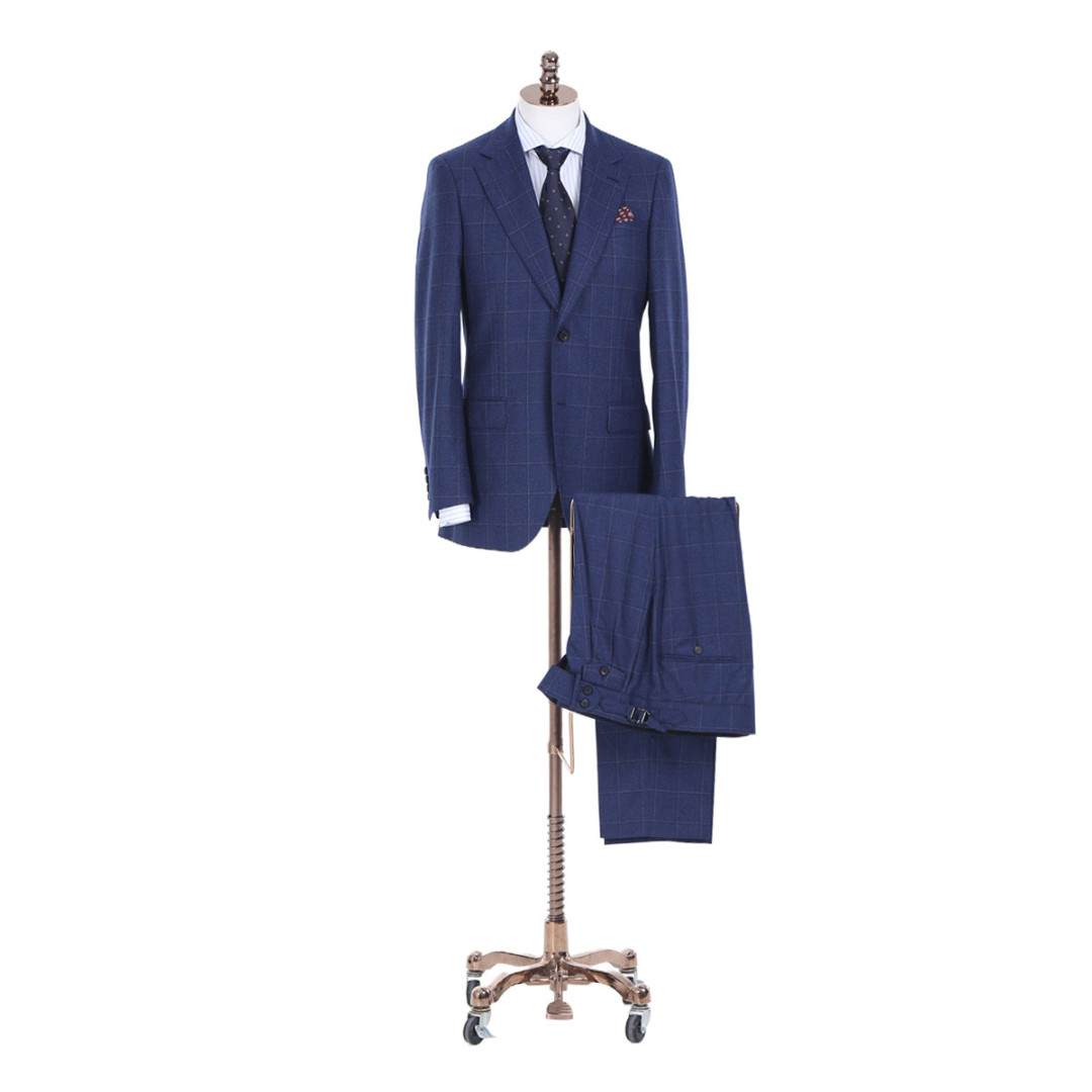 100% Italian wool and windowpane go together great when crafting the perfect custom blue suit. This fabric is as luxurious as it is versatile. Pair this blue suit with any custom shirt to show off its two tone windowpane pattern.