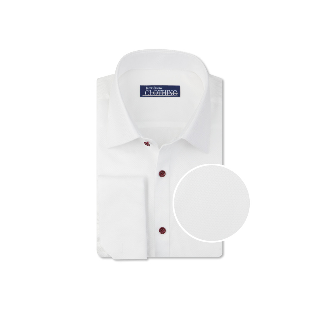 A creative combination of white jacquard, red buttons and cufflinks. This truly speaks custom, especially when it is custom to your body.