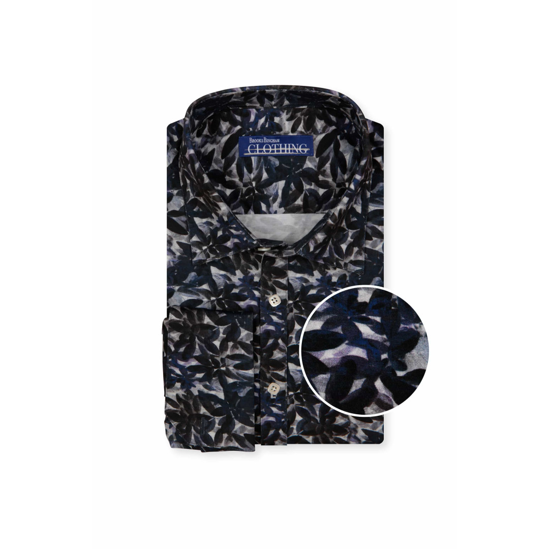 A dark blue floral stretch shirt that will surely pop with a solid suit or simply worn on its own. Style with your go to cufflinks.